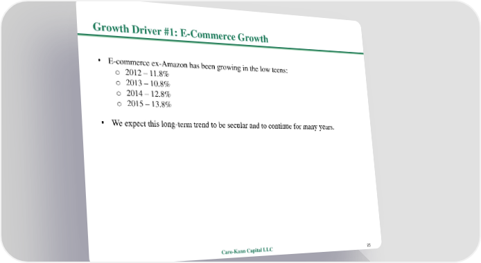 Growth Driver #1: E-Commerce Growth • E-commerce ex-Amazon has been growing in the low teens: o 2012 – 11.8% o 2013 – 10.8% o 2014 – 12.8% o 2015 – 13.8% • We expect this long-term trend to be secular and to continue for many years. Caro-Kann Capital LLC 25