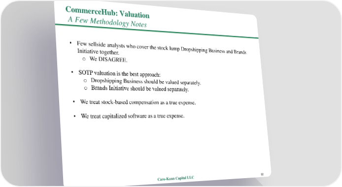 CommerceHub: Valuation A Few Methodology Notes • Few sellside analysts who cover the stock lump Dropshipping Business and Brands Initiative together. o We DISAGREE. • SOTP valuation is the best approach: o Dropshipping Business should be valued separately. o Brands Initiative should be valued separately. • We treat stock-based compensation as a true expense. • We treat capitalized software as a true expense. Caro-Kann Capital LLC 62