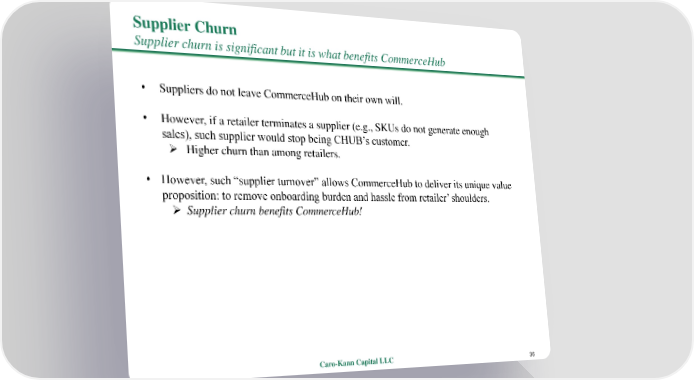 Supplier Churn Supplier churn is significant but it is what benefits CommerceHub • Suppliers do not leave CommerceHub on their own will. • However, if a retailer terminates a supplier (e.g., SKUs do not generate enough sales), such supplier would stop being CHUB’s customer. ➢ Higher churn than among retailers. • However, such “supplier turnover” allows CommerceHub to deliver its unique value proposition: to remove onboarding burden and hassle from retailer’ shoulders. ➢ Supplier churn benefits CommerceHub! Caro-Kann Capital LLC 36