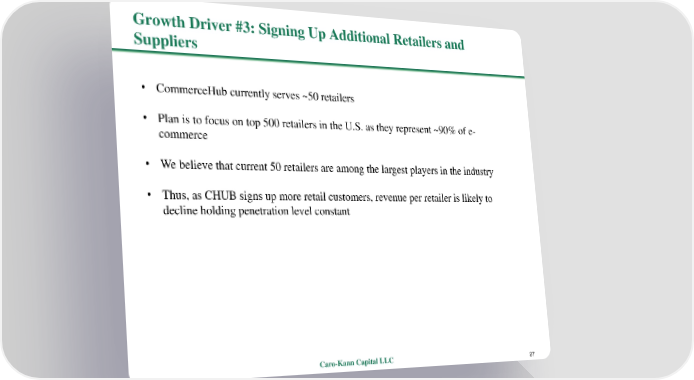 Growth Driver #3: Signing Up Additional Retailers and Suppliers • CommerceHubcurrently serves ~50 retailers • Plan is to focus on top 500 retailers in the U.S. as they represent ~90% of e- commerce • We believe that current 50 retailers are among the largest players in the industry • Thus, as CHUB signs up more retail customers, revenue per retailer is likely to decline holding penetration level constant Caro-Kann Capital LLC 27