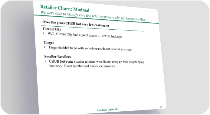Retailer Churn: Minimal We were able to identify very few retail customers who left CommerceHub Over the years CHUB lost very few customers: Circuit City • Well, Circuit City had a good reason … it went bankrupt. Target • Target decided to go with an in-house solution several years ago. Smaller Retailers • CHUB lost some smaller retailers who did not ramp up their dropshipping business. Exact number and names are unknown. Caro-Kann Capital LLC 35