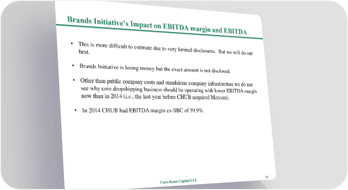 Brands Initiative’s Impact on EBITDA margin and EBITDA • This is more difficult to estimate due to very limited disclosures. But we will do our best. • Brands Initiative is losing money but the exact amount is not disclosed. • Other than public company costs and standalone company infrastructure we do not see why core dropshipping business should be operating with lower EBITDA margin now than in 2014 (i.e., the last year before CHUB acquired Mercent). • In 2014 CHUB had EBITDA margin ex-SBC of 59.9%. Caro-Kann Capital LLC 55
