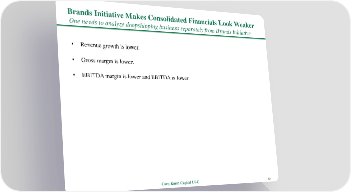 Brands Initiative Makes Consolidated Financials Look Weaker One needs to analyze dropshipping business separately from Brands Initiative • Revenue growth is lower. • Gross margin is lower. • EBITDA margin is lower and EBITDA is lower. Caro-Kann Capital LLC 52