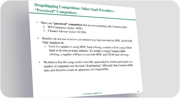 Dropshipping Competition: Other SaaS Providers – “Perceived” Competitors • There are “perceived” competitors that are not competing with CommerceHub: 1. SPS Commerce (ticker: SPSC) 2. Channel Advisor (ticker: ECOM) • Retailers do not use or use in a de minimis way SaaS provided by SPSC and ECOM. Only suppliers do. o Even if a supplier is using SPSC SaaS offering, a retailer will be using CHUB SaaS or its own in-house solution. If a retailer is using CommerceHub offering, a supplier will have to use both SPSC and CHUB SaaS offerings. • We believe that this usage point is not fully appreciated by market participants as a number of companies use the term “dropshipping” differently than CommerceHub does and therefore create an appearance of comparability. Caro-Kann Capital LLC 45