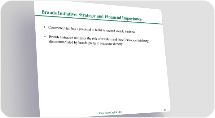 Brands Initiative: Strategic and Financial Importance • CommerceHubhas a potential to build its second sizable business. • Brands Initiative mitigates the risk of retailers and thus CommerceHub being disintermediated by brands going to consumer directly. Caro-Kann Capital LLC 56