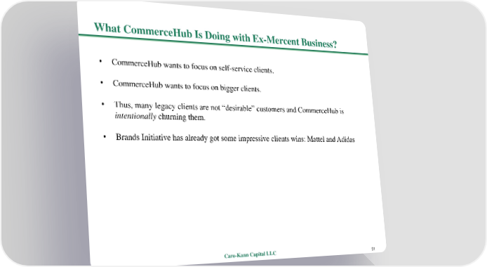 What CommerceHubIs Doing with Ex-MercentBusiness? • CommerceHubwants to focus on self-service clients. • CommerceHubwants to focus on bigger clients. • Thus, many legacy clients are not “desirable” customers and CommerceHub is intentionally churning them. • Brands Initiative has already got some impressive clients wins: Mattel and Adidas Caro-Kann Capital LLC 51