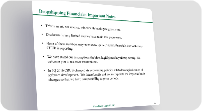 Dropshipping Financials: Important Notes • This is an art, not science, mixed with intelligent guesswork. • Disclosure is very limited and we have to do this guesswork. • None of these numbers may ever show up in CHUB’s financials due to the way CHUB is reporting. • We have stated our assumptions (in blue, highlighted in yellow) clearly. We welcome you to use own assumptions. • In 3Q 2016 CHUB changed its accounting policies related to capitalization of software development. We intentionally did not incorporate the impact of such changes so that we have comparability to prior periods. Caro-Kann Capital LLC 64