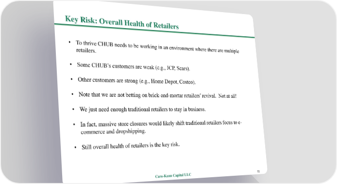 Key Risk: Overall Health of Retailers • To thrive CHUB needs to be working in an environment where there are multiple retailers. • Some CHUB’s customers are weak (e.g., JCP, Sears). • Other customers are strong (e.g., Home Depot, Costco). • Note that we are not betting on brick-and-mortar retailers’ revival. Not at all! • We just need enough traditional retailers to stay in business. • In fact, massive store closures would likely shift traditional retailers focus to e- commerce and dropshipping. • Still overall health of retailers is the key risk. Caro-Kann Capital LLC 72