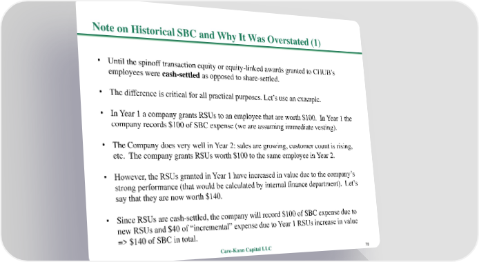 Note on Historical SBC and Why It Was Overstated (1) • Until the spinoff transaction equity or equity-linked awards granted to CHUB’s employees were cash-settled as opposed to share-settled. • The difference is critical for all practical purposes. Let’s use an example. • In Year 1 a company grants RSUs to an employee that are worth $100. In Year 1 the company records $100 of SBC expense (we are assuming immediate vesting). • The Company does very well in Year 2: sales are growing, customer count is rising, etc. The company grants RSUs worth $100 to the same employee in Year 2. • However, the RSUs granted in Year 1 have increased in value due to the company’s strong performance (that would be calculated by internal finance department). Let’s say that they are now worth $140. • Since RSUs are cash-settled, the company will record $100 of SBC expense due to new RSUs and $40 of “incremental” expense due to Year 1 RSUs increase in value => $140 of SBC in total. Caro-Kann Capital LLC 78
