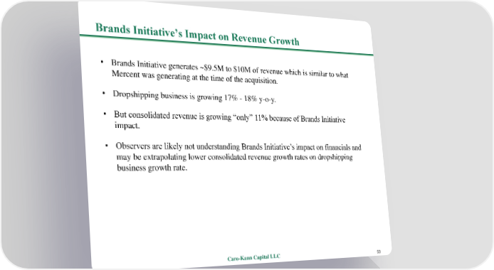 Brands Initiative’s Impact on Revenue Growth • Brands Initiative generates ~$9.5M to $10M of revenue which is similar to what Mercent was generating at the time of the acquisition. • Dropshipping business is growing 17% - 18% y-o-y. • But consolidated revenue is growing “only” 11% because of Brands Initiative impact. • Observers are likely not understanding Brands Initiative’s impact on financials and may be extrapolating lower consolidated revenue growth rates on dropshipping business growth rate. Caro-Kann Capital LLC 53