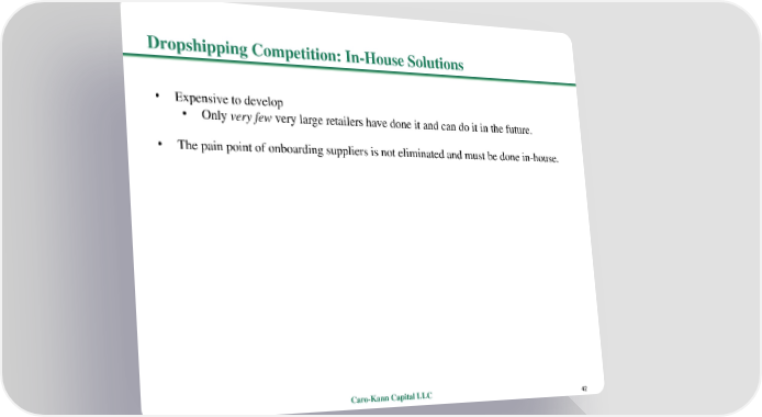 Dropshipping Competition: In-House Solutions • Expensive to develop • Only very few very large retailers have done it and can do it in the future. • The pain point of onboarding suppliers is not eliminated and must be done in-house. Caro-Kann Capital LLC 42