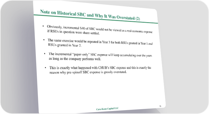 Note on Historical SBC and Why It Was Overstated (2) • Obviously, incremental $40 of SBC would not be viewed as a real economic expense if RSUs in question were share-settled. • The same exercise would be repeated in Year 3 for both RSUs granted in Year 1 and RSUs granted in Year 2. • The incremental “paper-only” SBC expense will keep accumulating over the years as long as the company performs well. • This is exactly what happened with CHUB’s SBC expense and this is exactly the reason why pre-spinoff SBC expense is grossly overstated. Caro-Kann Capital LLC 79