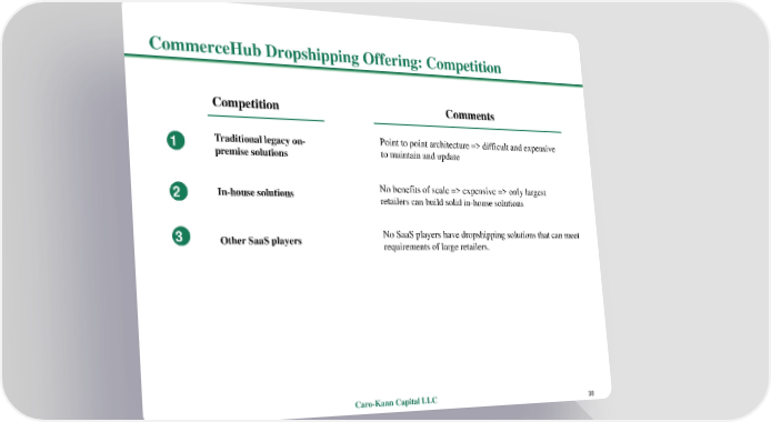 CommerceHubDropshipping Offering: Competition Competition Comments 1 Traditional legacy on- Point to point architecture => difficult and expensive premise solutions to maintain and update 2 In-house solutions No benefits of scale => expensive => only largest retailers can build solid in-house solutions 3 Other SaaS players No SaaS players have dropshipping solutions that can meet requirements of large retailers. Caro-Kann Capital LLC 38