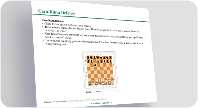 Caro-KannDefense Caro-KannDefense • Chess defense against the king’s pawn opening. • The opening is named after the English player Horato Caro and the Austrian player Marcus Kann who analyzed it in 1886.* • Caro-Kann Defense is more solid and robust than many alternatives and, thus, Black enjoys a significantly smaller chance of losing. • However, due to a strong position and pawn structure, Caro-Kann Defense results in a strong likelihood of Black winning later. * Wikipedia. The graphic display (http://en.wikipedia.org/wiki/Caro%E2%80%93Kann_Defence) Caro-Kann Capital LLC 4