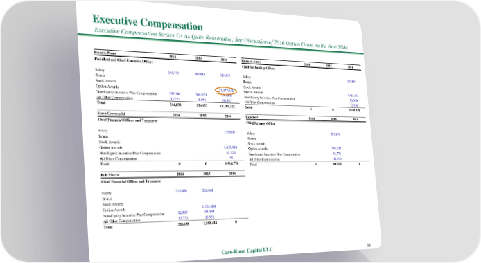 Executive Compensation Executive Compensation Strikes Us As Quite Reasonable; See Discussion of 2016 Option Grant on the Next Slide Francis Poore 2014 2015 2016 Richard Jones 2014 2015 2016 President and Chief Executive Officer Chief Technology Officer Salary 354,775 369,048 385,457 Salary 279,857 Bonus Bonus Stock Awards Stock Awards Option Awards 12,177,842 Option Awards 3,549,353 Non-Equity Incentive Plan Compensation 197,340 165,973 150,000 Non-Equity Incentive Plan Compensation 90,300 All Other Compensation 12,723 15,951 66,923 All Other Compensation 15,948 Total 564,838 550,972 12,780,222 Total 0 0 3,935,458 Mark Greenquist 2014 2015 2016 Eric Best 2014 2015 2016 Chief Financial Officer and Treasurer Chief Strategy Officer Salary 175,000 Salary 224,170 Bonus Bonus Stock Awards Stock Awards Option Awards 1,653,999 Option Awards 587,520 Non-Equity Incentive Plan Compensation 85,723 Non-Equity Incentive Plan Compensation 68,738 All Other Compensation 48 All Other Compensation 12,075 Total 0 0 1,914,770 Total 0 892,503 0 Bob Marro 2014 2015 2016 Chief Financial Officer and Treasurer Salary 218,938 248,968 Bonus Stock Awards Option Awards 1,224,000 Non-Equity Incentive Plan Compensation 92,997 99,499 All Other Compensation 12,723 15,951 Total 324,658 1,588,418 0 Caro-Kann Capital LLC 58